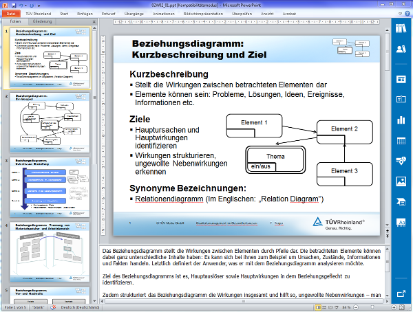 Mit dem Beziehungsdiagramm werden die Wirkungen zwischen Elementen durch Pfeile dargestellt. Die betrachteten Elemente können dabei ganz unterschiedliche Inhalte haben: Es kann sich bei ihnen zum Beispiel um Ursachen, Zustände, Informationen und Fakten handeln. Letztlich definiert der Anwender, was er mit dem Beziehungsdiagramm analysieren möchte.