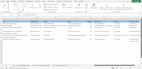 | Variante 2 | Die Spalten stehen für Zeitpunkte, die Zeilen für die Kommunikationskanäle und in den Tabellenzellen die interessierten Parteien. |