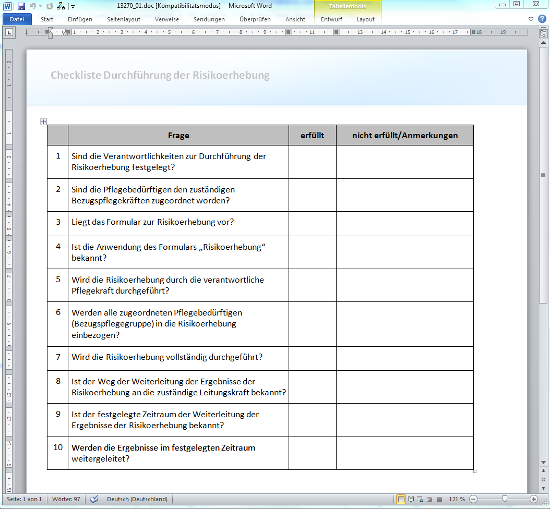 Dieser Beitrag soll dazu dienen, leitenden Pflegefachkräften praktische Hilfen zur Überprüfung und Einhaltung der pflegerischen Ergebnisqualität aufzuzeigen. Durch die praktische Anwendung von Erhebungs- und Steuerungsinstrumenten wird das Erkennen von Risikopotenzialen möglich, mit dem Ziel auf bestehende Risikofaktoren mit entsprechenden Interventionen/Maßnahmen reagieren zu können, um die Ergebnisqualität weiter zu steigern. Arbeitshilfen: von: |